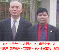 梅安富先生軍人出身(曾經在中國馬蘭核試驗基地工作十多年,為核武器發(fā)展做出了卓越貢獻、被評為八級軍殘)、高級經濟師、中共優(yōu)秀黨員、天臺山人氏。現(xiàn)任中共鄭州臺州商會支部委員會書記、常務副會長兼秘書長、河南省保健品協(xié)會副會長、全國政協(xié)副主席、中共中央委員、中國殘聯(lián)主席鄧樸方先生與鄭州臺州商會支部書記兼秘書長、《百花散》傳人梅安富先生親切交談鄭州市腫瘤康復協(xié)會名譽會長。2005年5月,作為臺州古代中醫(yī)秘方梅氏《百花散》